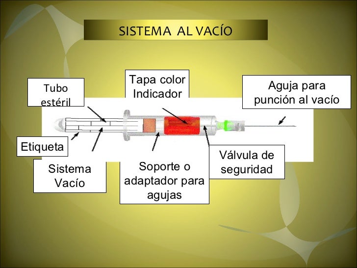 ¿como funciona el sistema de extraccion de sangre al vacio. · la aguja si tiene que ser desechada inmediatamente para no contaminar o infectar, la camisa del sistema (vacutainer) puede reutilizarse, debido a que no tiene contacto directo en ningun momento con la sangre o con el paciente, unicamente es el intermediario entre la aguja y el tubo al vacio. El tubo luego de que se utiliza la sangre, se puede. Extracción de sangre en vacío y no reutilización de porta. La utilización de sistemas de extracción al vacío dotados de dispositivo de seguridad biológica es el método más seguro y de mayor calidad para la extracción de sangre venosa. La utilidad de los portatubos viene determinada por la protección que ofrece al profesional frente al pinchazo con la aguja de inserción en el tubo, a la. Hemocultivos enferurg. Objetivo. Obtener una muestra de sangre para estudio microbiológico, con el fin de establecer el diagnóstico etiológico de las bacteriemias. Ficha estÁndar de familia del catÁlogo de. Familia 0026 tubos para extracciÓn de sangre con sistema de vacÍo tipo de unidad de medida cantidad i. Alcance esta familia incluye los tubos para extracción de sangre al vacío, llamados en algunos casos como vacuteiner (n ombre de marca). Ii. Detalle tÉcnico. Extracción de sangre en tubos al vacío (vacuteiner) youtube. Extracción de muestras de sangre por la técnica al vacío pablo casals duration 1118. Pablo casals 18,395 views. 1118. Top 10 personas que fueron muy lejos para extraccion sanguinea. Sistema de vacio vacutainer simplelabs.Ru. Compatible con el sistema de extracción de sangre al vacío. Tubos secos vacutainer ml de vacio vacutainer suero. Agujas para toma de muestra con tubos al vacio normalmente agujas de g,. Procedimiento extracción venosa con sistema al vacio 1. Diferentes volúmenes de drenado disponibles (vacío de extracción) para las.